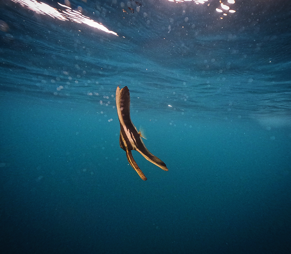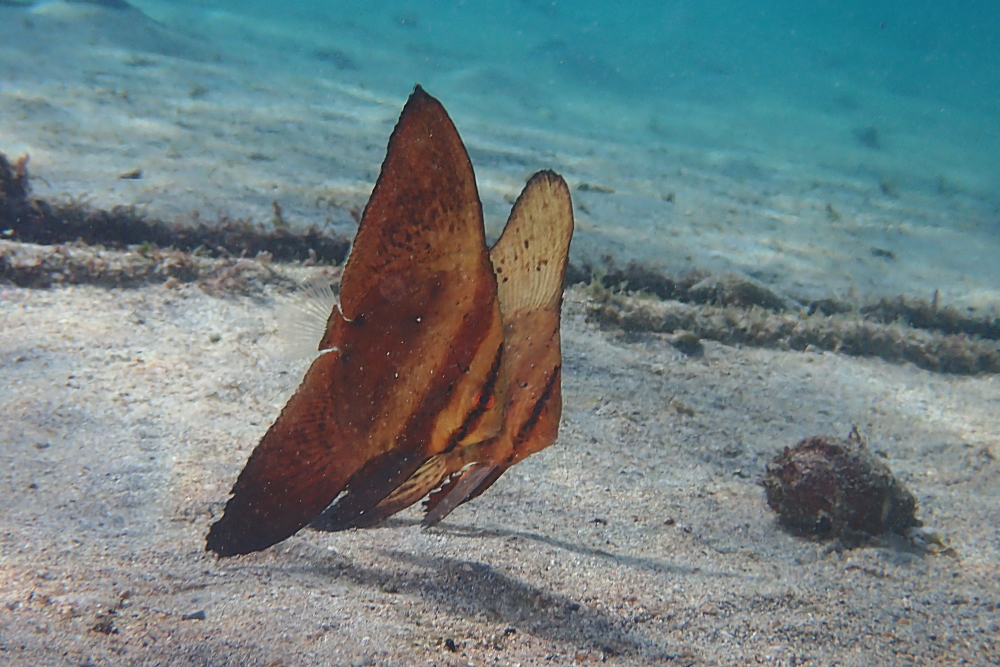 超透明度がよかった湾内では水底付近をフラフラしているナンヨウツバメウオたち。
