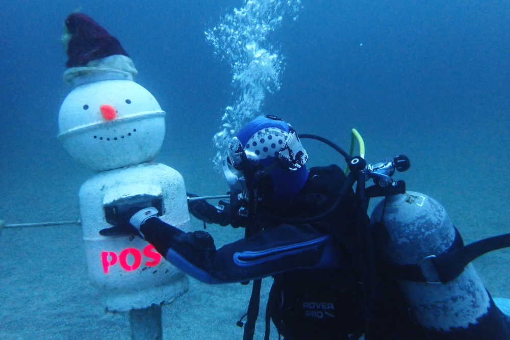前回はまだ水中にクリスマスツリーは入っていませんでしたが、今回は水中クリスマススリーや雪だるまバージョンのポストと記念撮影をして少し早めのクリスマスを楽しんできました。