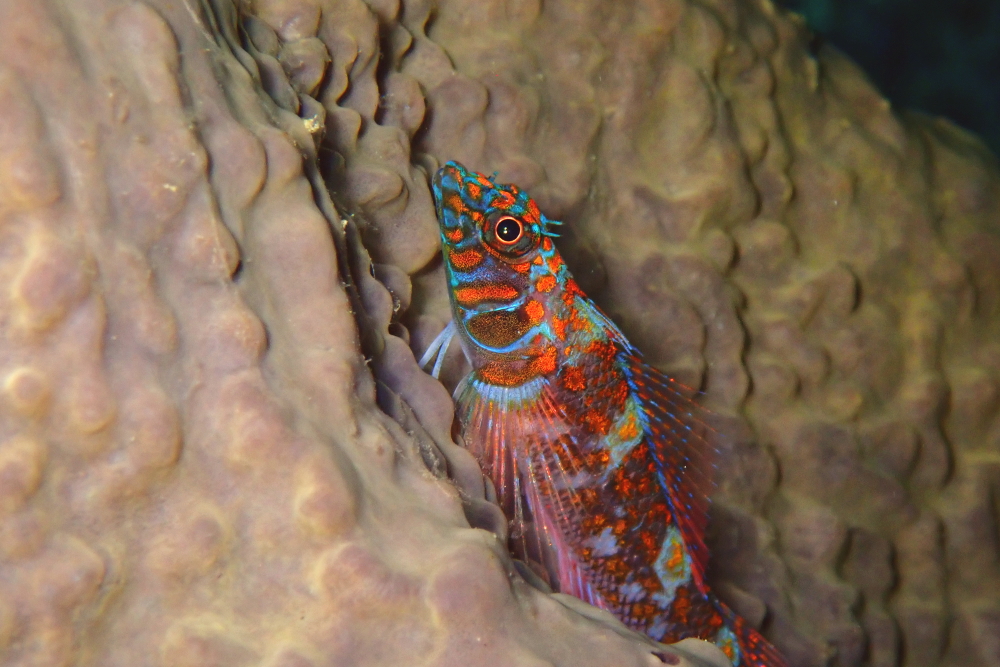 オオバンカイメンにはアカスジウミタケハゼ、セボシウミタケハゼ、キビレヘビギンポ等が居ついていますが、YOKOお気に入り生物でもあるヒメギンポはオレンジ色の柄が綺麗ですよ。