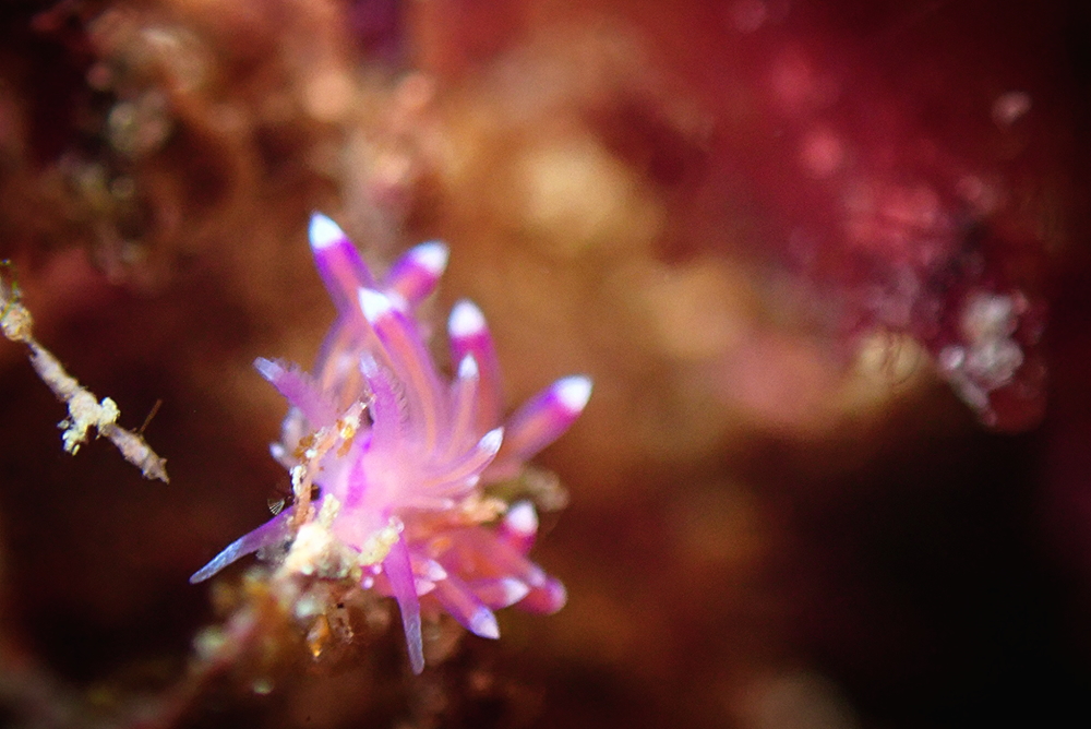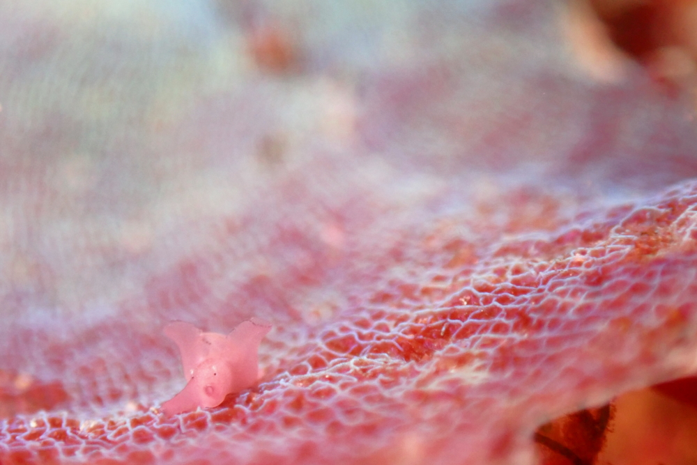 左下に正面向いてるピンクの生物のクロヘリアメフラシ幼体!