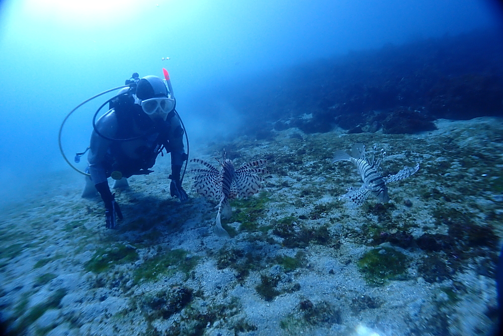 砂地でジッとしていると、どこからともなく続々と現れるミノカサゴたち。