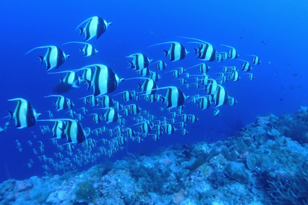ギンガメアジの群れやツノダシの群れ、ホウセキキントキの群れ、マダラタルミの群れ、サメの群れ…とにかく魚影の濃いパラオの海に感動しっぱなし♪