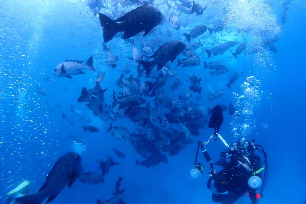 ツノダシを追いかけてグレイリーフシャークも大集合。