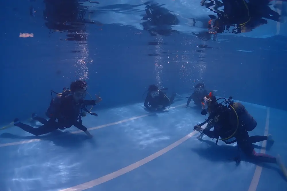 まずは担当インストラクターと一緒に自宅で勉強してきた学科の内容、知識の再確認を行います。未知の世界のことなので、わからないことはしっかりと身に付けましょう。わからないことが解決出来たらプール施設へ移動して限定水域で実技練習を行います。 |